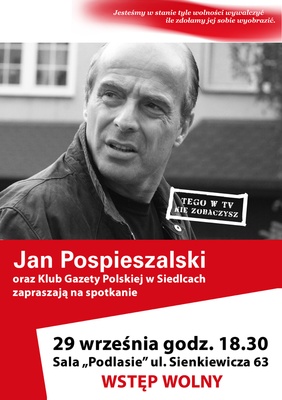 Siedlecki Klub Gazety Polskiej i Poseł Krzysztof Tchórzewski zapraszają na spotkanie z redaktorem Janem Pospieszalskim, które odbędzie się w czwartek 29 września w Sali Podlasie przy ul. Sienkiewicza.