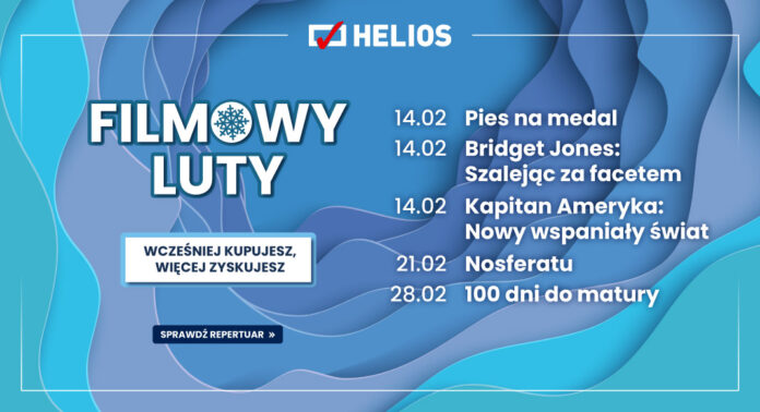 Kino Helios zaprasza na Filmowy Luty. Na kinomaniaków czekać będą takie premiery jak: „Pies na medal”, Bridget Jones: Szalejąc za facetem”, „Kapitan Ameryka: Nowy wspaniały świat”, „Nosferatu” czy „100 dni do matury”.