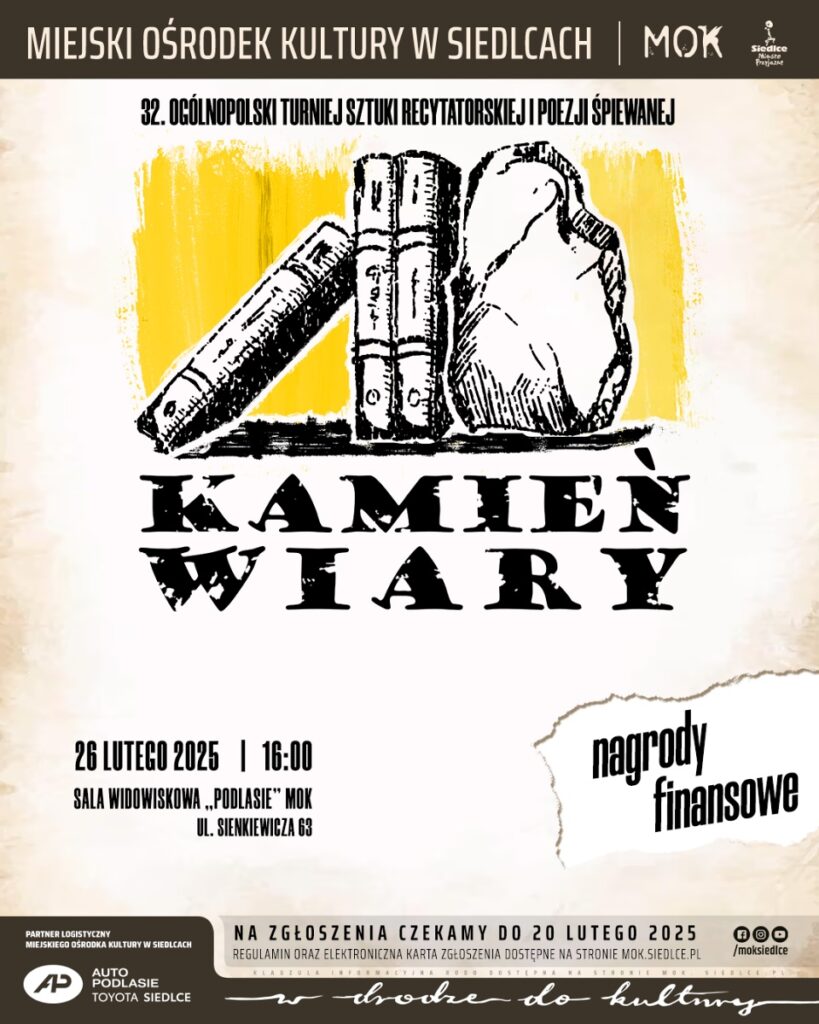 Miejski Ośrodek Kultury zaprasza w środę, 26 lutego o godz. 16. do sali „Podlasie” na 32. Ogólnopolski Turniej Sztuki Recytatorskiej i Poezji Śpiewanej „Kamień Wiary”.