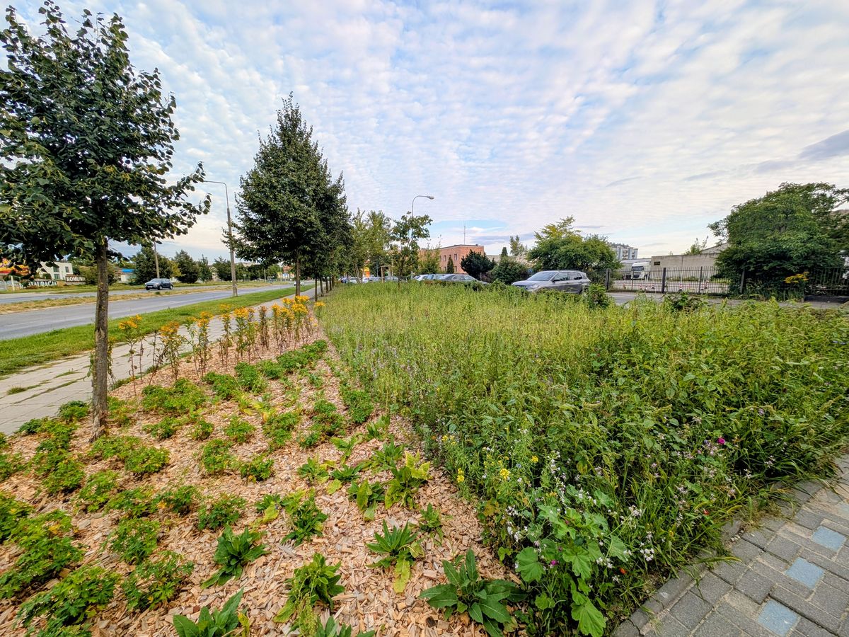 Zieleniec z nowymi nasadzeniami w centrum miasta.