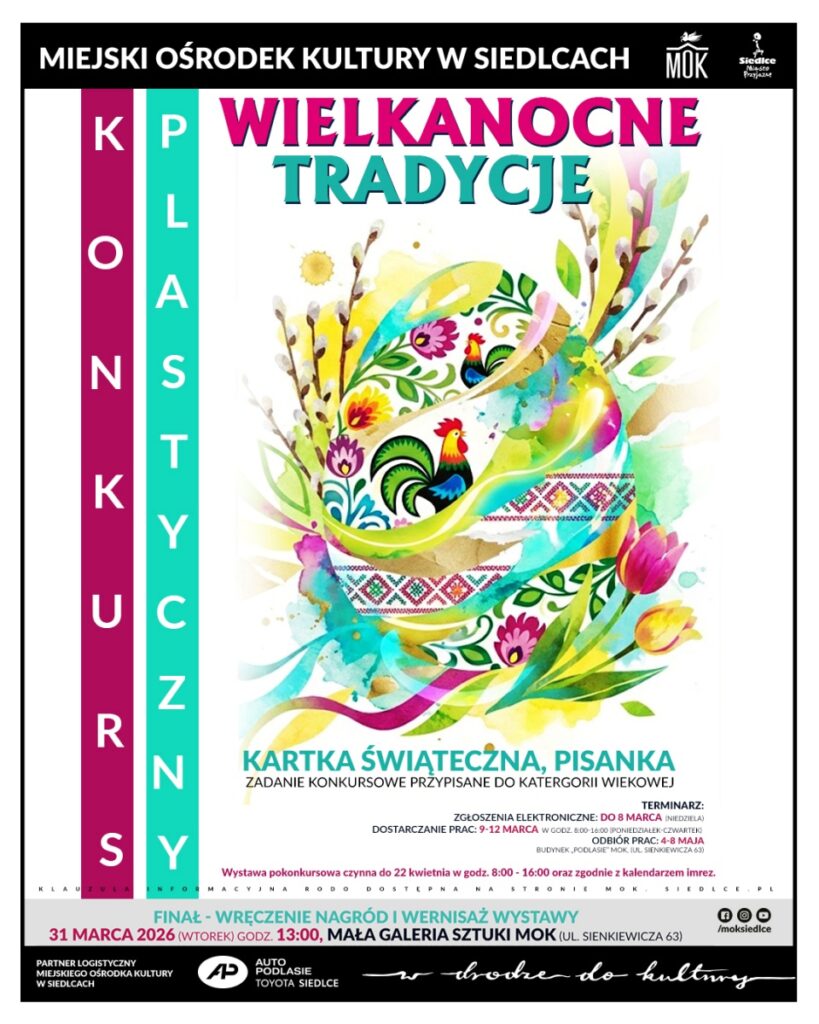 Miejski Ośrodek Kultury zaprasza do udziału w konkursie plastycznym „Wielkanocne tradycje 2026”. Jego celem jest kultywowanie folkloru i zwyczajów związanych ze Świętami Wielkanocnymi, pogłębianie wiedzy o symbolice świątecznej oraz rozwijanie zainteresowań plastycznych dzieci i młodzieży.