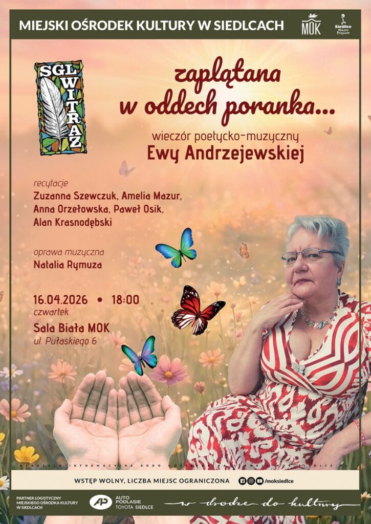 Miejski Ośrodek Kultury oraz Siedlecka Grupa Literacka „Witraż” zapraszają w czwartek, 16 kwietnia o godz. 18. do Sali Białej na wieczór poetycko-muzyczny Ewy Andrzejewskiej „Zaplątana w oddech poranka”.